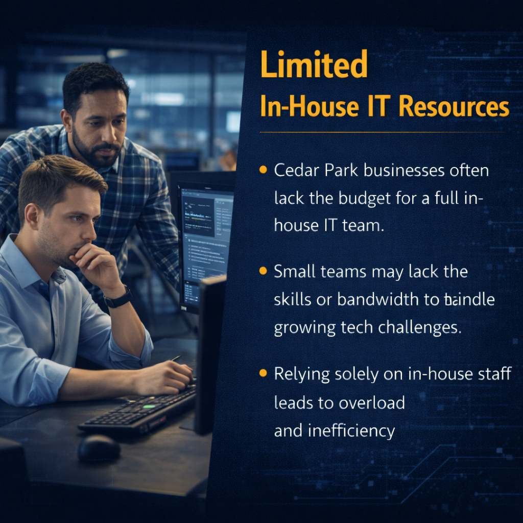Hiring and retaining qualified IT staff is costly and increasingly difficult. Many Cedar Park businesses depend on overextended internal teams or reactive break-fix support that struggles to meet today’s IT demands.