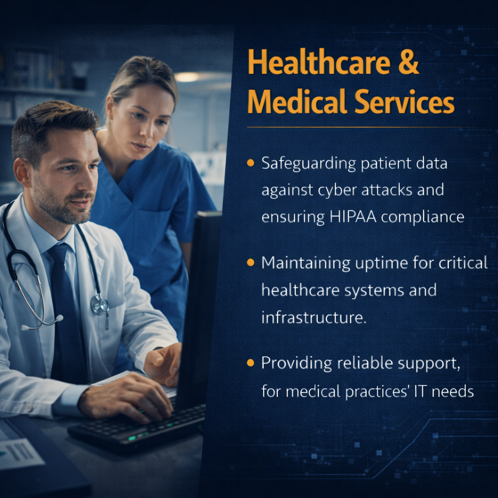 We deliver fully compliant IT environments that meet strict HIPAA regulations, secure patient data, and provide reliable support for medical devices and electronic health record (EHR) systems for clinics and private practices.