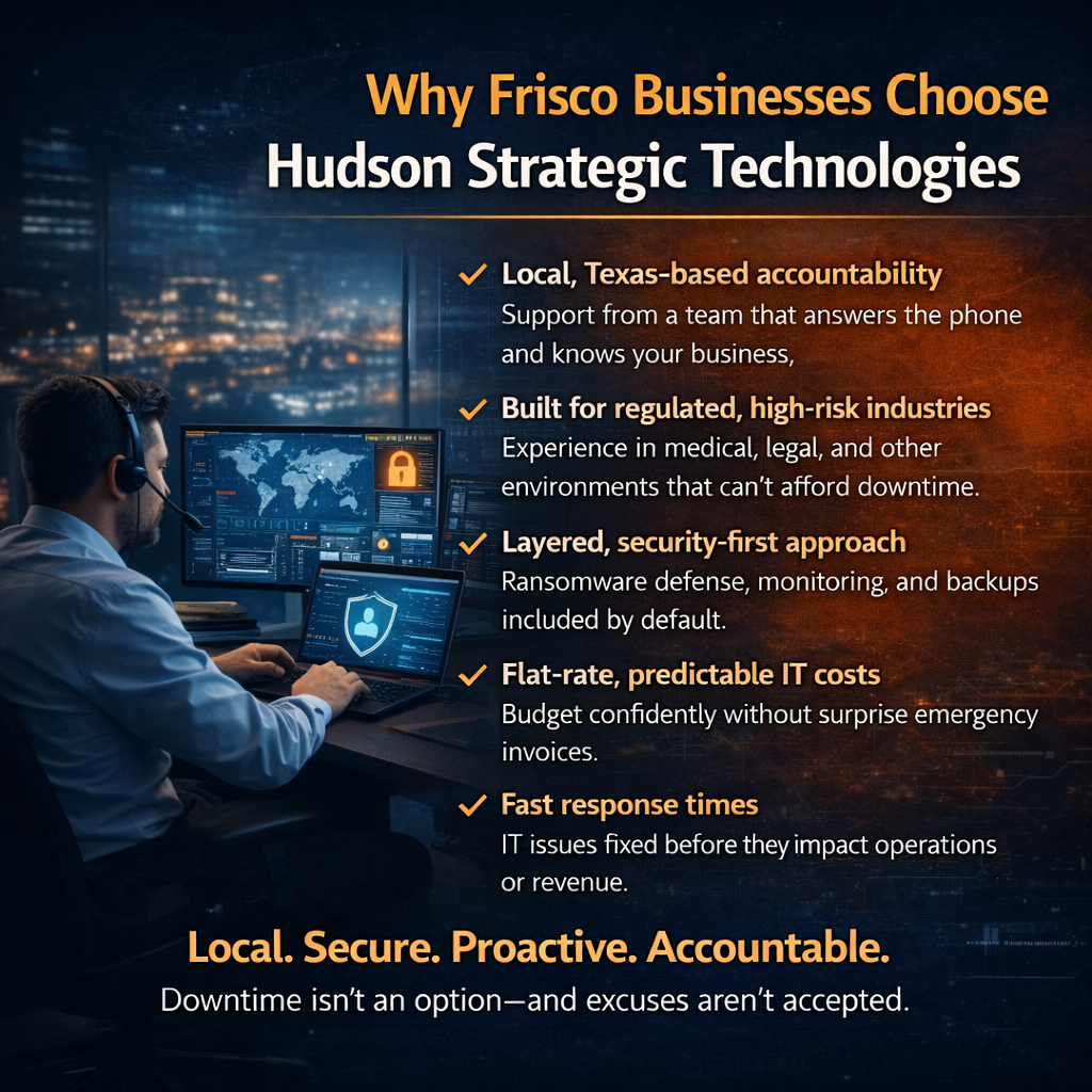 Hudson Strategic Technologies proudly delivers reliable IT Support Frisco TX and managed services to businesses throughout Frisco, Texas. From fast on-site response near The Star and Stonebriar Centre, to proactive monitoring for offices in Hall Office Park and the Frisco Independent School District (ISD) area, our team ensures your business technology runs without interruption.